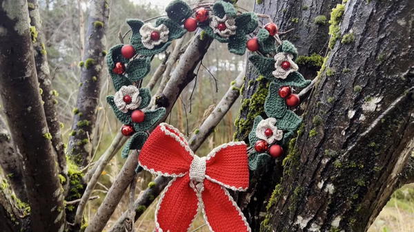 Once all the crocheted pieces are finished, the assembly process brings the Christmas wreath to life. By combining the rustic texture of the natural branches with the rich detail of the crocheted leaves, bow, and metallic flower, you create a beautiful, custom, and festive piece of holiday decor.