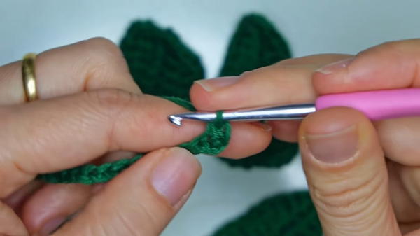Detailed Leaf: The leaf uses five different stitch heights (SC up to DTR) in a single row to achieve a natural, pointed shape.