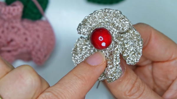 Crochet Yarn: Green yarn (for leaves), Red yarn (or color of choice for the bow), and a glittery/metallic yarn (gold/silver) for the flower and bow edging.