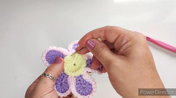 - Attach the center to the flower by making three slip stitches into each petal edge.