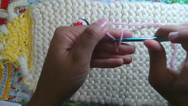 - Securely knot the white yarn onto the last stitch from the previous round. Cut off the unused pink/orange yarn.