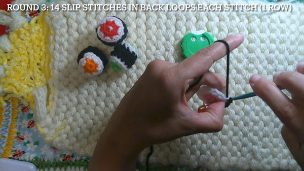 - Crochet 14 single crochets in the back loop only. This technique adds dimension to the sushi roll by distinguishing the rice from the seaweed wrap.