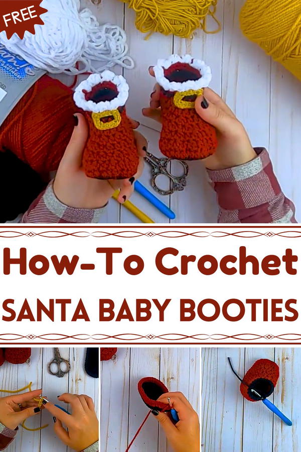 This tutorial guide how to crochet adorable Santa baby booties for newborns (0-3 months) with a cozy and festive design. Perfect as a Christmas gift or memorable keepsake, the booties feature a fluffy white cuff, a bold red body, a black band, and a golden buckle. Originally styled for sale on Etsy, this pattern is now shared with viewers for personal use. Follow the detailed steps to crochet these charming booties, from forming the sole to stitching the final decorative buckle.