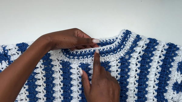 - 2 rows of white yarn, 2 rows of blue, and then 1 final row of white yarn for the neckline.