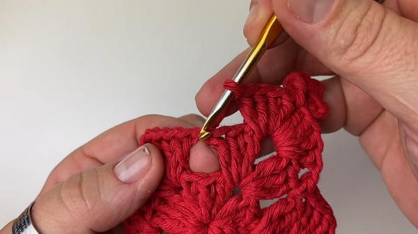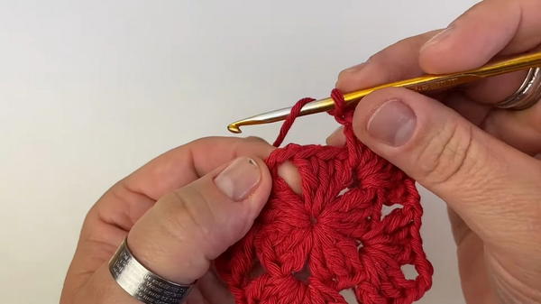 Then you move into successive rounds where you chain a few stitches, skip spaces, and return with clusters of double crochets or trebles to form each of the star’s five points.