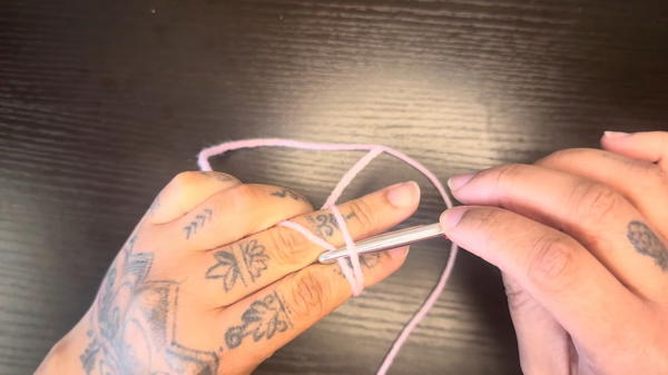- Wrap yarn around your fingers to form an “X.” Insert the hook under the first strand, pull up the second strand, and create a loop to start a magic circle.