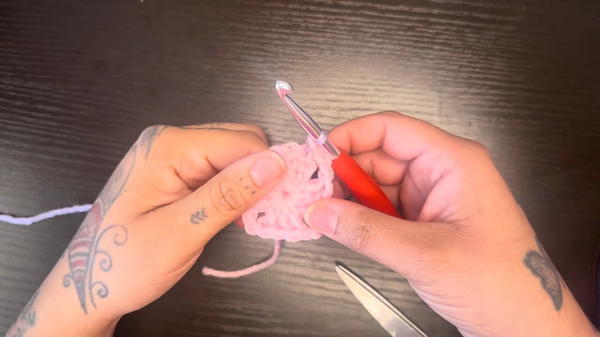 - Cut the yarn and attach a new color using a secure knot, tying the old working yarn to the new color. Cut extra yarn after securing.