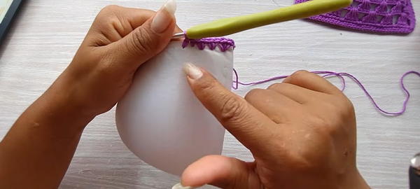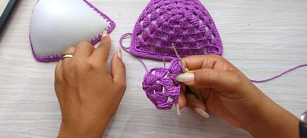 - Attach crochet cup to bra padding by working single crochet or slip stitches through pierced holes, securing fabric to padding.