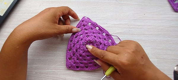 - Repeat 4 dc block + chain 2 twice more to form a triangle base of 3 blocks.