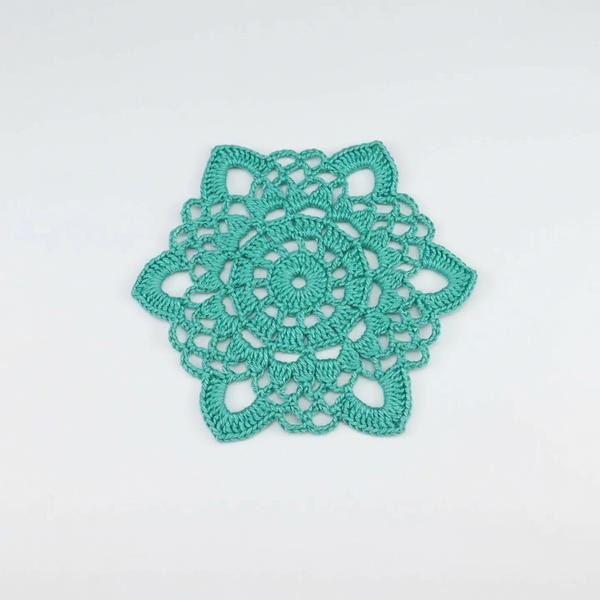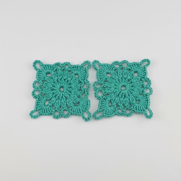 - In each chain-2 space from previous round, make (4 dc, chain 2, 4 dc) to form fans.