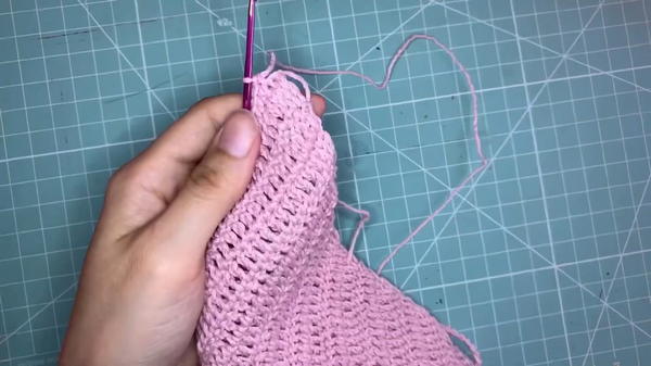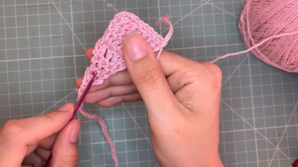 - At the end of each row, increase by working 2 dc into the last stitch.