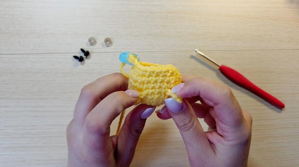 - Before finishing the chick, place safety eyes between Rounds 7 and 8, ensuring they align with the arms. Leave 3 stitches of visible spacing between the eyes.