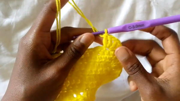 - Skip one stitch and repeat the pattern (two DCs, chain 1, two DCs) in the next stitch.
