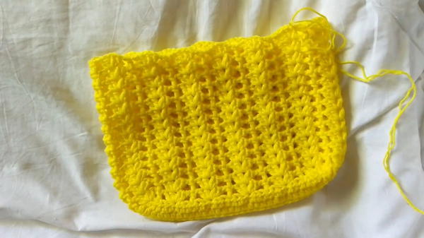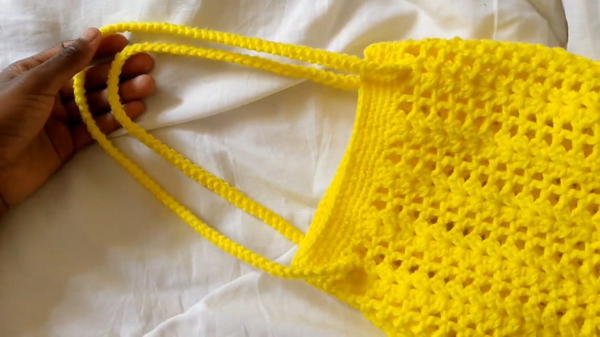 - Weave the straps through the shell stitch gaps evenly on both sides of the bag using a yarn needle or your fingers.