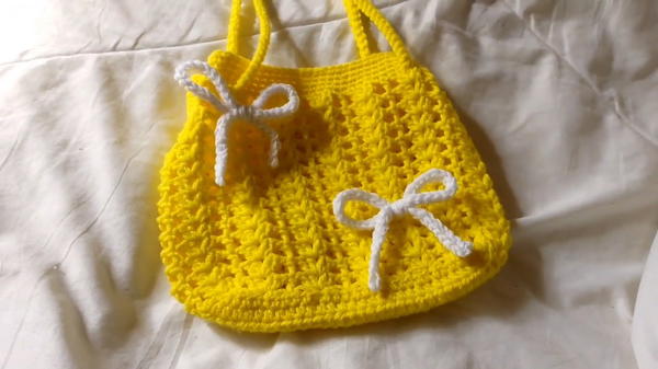 - Tie the slip-stitched chains into bows and attach them to the bag for an extra decorative touch.