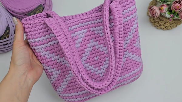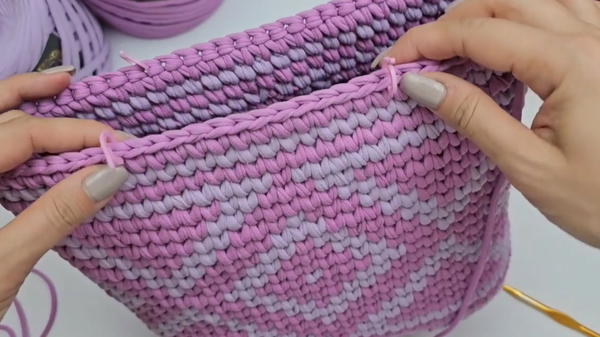 This measured approach ensures reliable support and an optimal bottom size of 26 cm by 12 cm, providing ample space for essentials. By the ninth row, the introduction of lilac yarn brings the jacquard motif to life—a beautiful dance of colors that captivates and delights.