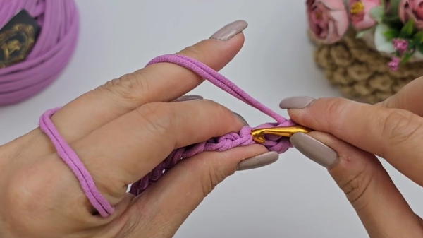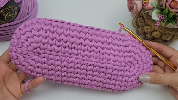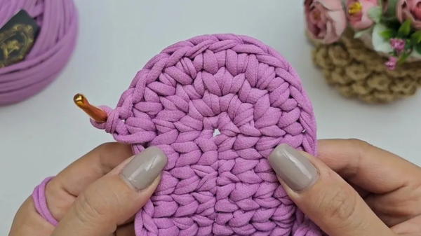 The process starts with creating a sturdy base. Using Altyn yarn in lavender, a foundation of 16 chain stitches sets the stage for the bag's robust structure. The initial rows involve crafting single crochets, with strategic increases made at the corners to form the base’s rounded edges, achieving a total of 76 stitches by the eighth row.
