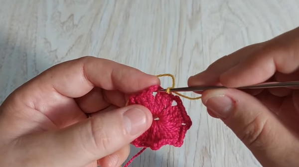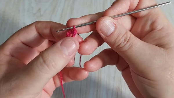 - Start with pink thread (or your first color). Make a slip knot and chain 6.