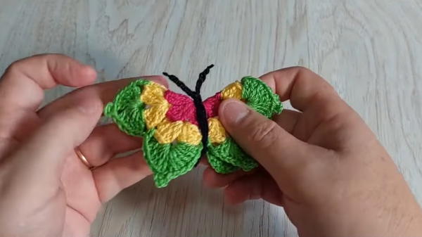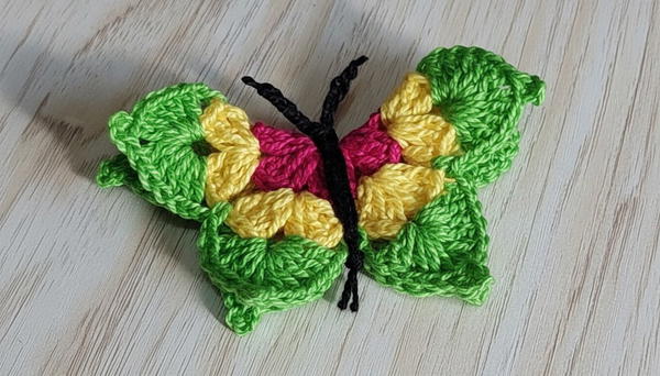To keep your color changes neat and avoid knots showing on the back, incorporate the new yarn tails inside the stitches as you switch colors and do not cut after every color change if working on a multi-colored butterfly. This also helps in sturdiness and cleaner finish.