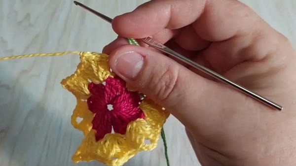 - Change to second color (yellow or your choice). Attach thread in any ch-2 space from previous round.