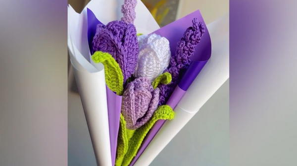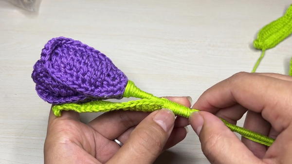 In this tutorial, the tutor demonstrates how to crochet tulip petals, leaves, and stems, providing detailed steps for assembling the final piece. You’ll learn techniques such as single crochet, half double crochet, double crochet, and increases to make 6 petals and versatile leaves to complete the flower.