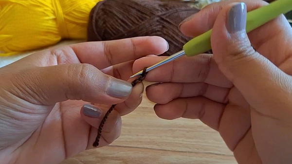 - For every stitch around the brown center, create two petals per loop, alternating chain stitches and slip stitches.