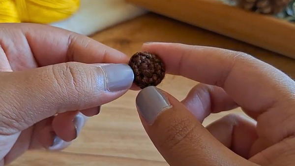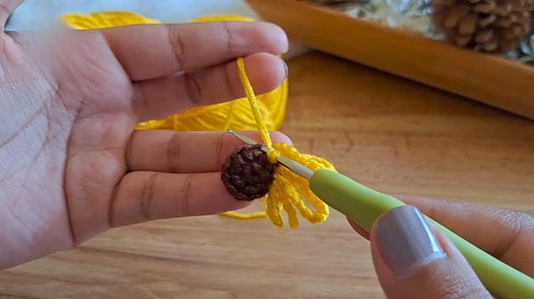 - Attach the yellow yarn to the front loops remaining from Round 3 of the brown center.