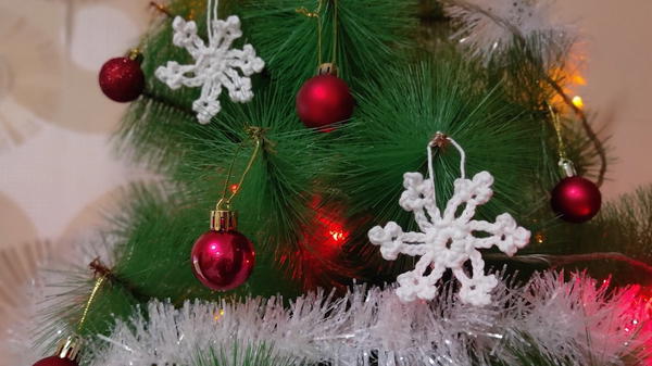 - If you want the ornament to hang, attach a small loop of yarn or string to the back of the snowflake. This makes it ideal for hanging on a Christmas tree.