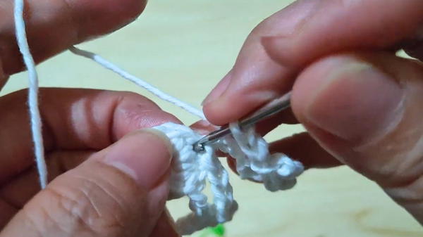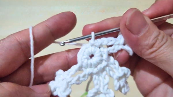 - Chain 3 again, slip stitch into the next stitch, and repeat until you’ve created a small chain loop. This loop sequence will add texture to the spoke.