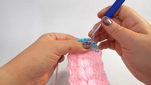 Next comes the addition of puff stitches, which are used to create the signature braided appearance. This pattern alternates between puff stitches and plain rows, giving it a balanced and neat look.