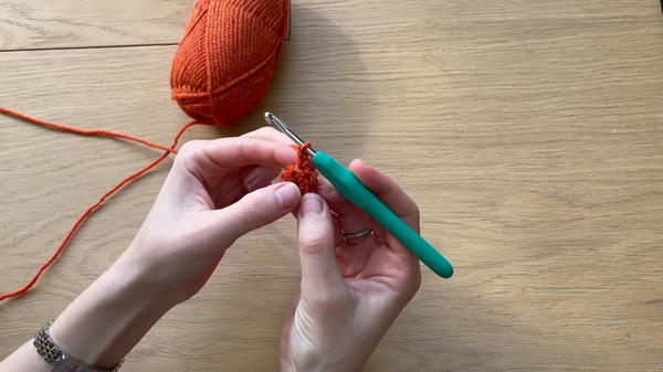 - Create a magic circle by wrapping the yarn around your finger. Insert the crochet hook, pull through a loop, and chain one. Then make nine single crochet (SC) stitches into the circle.