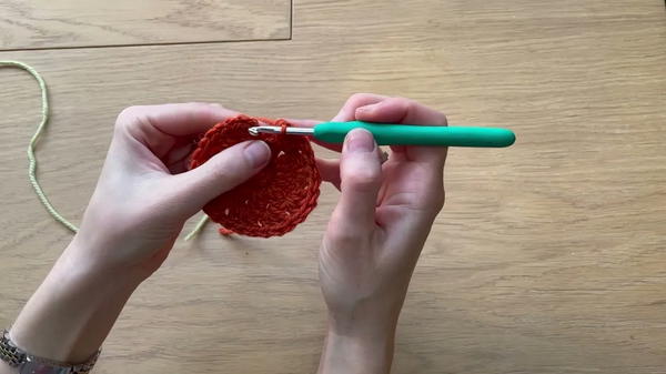 - Tighten the circle by pulling the small tail. Close the round with a slip stitch into the first SC.