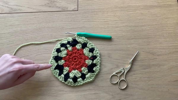 - As you move to Rounds 5–9, the increases are spaced further apart (e.g., in Round 6, make an increase after 5 granny clusters; in Round 7, after 6 granny clusters, etc.).