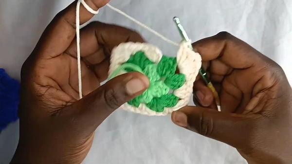 Repeat the same process, alternating colors if desired. Ensure that non-corner spaces have 3 double crochets, while corners have three double crochet, chain two, and another three double crochet stitches. Stop when each square measures approximately 4.5 inches.
