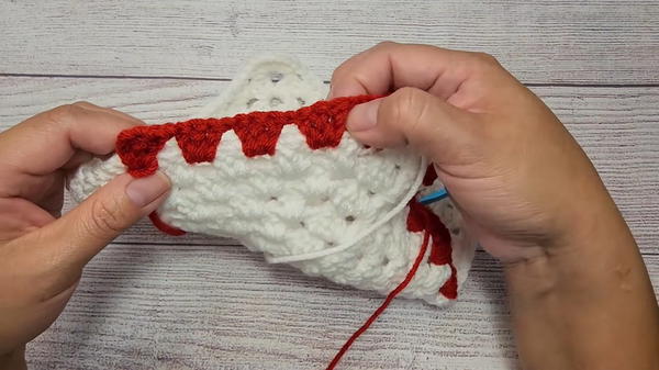 Color Change: After Row 5, fasten off the Red yarn. Repeat the 5-row process with the White yarn, then the Red yarn, and continue alternating until the desired length is achieved.