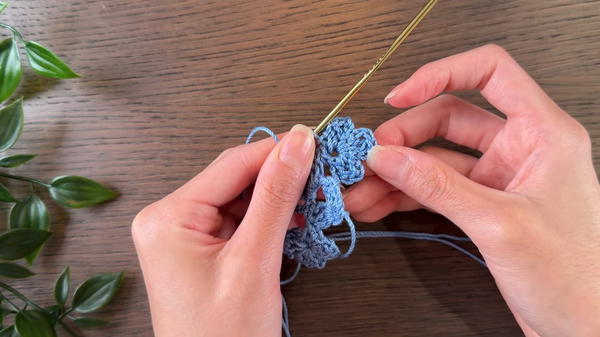- After finishing the flower, move back to the chain-three space in the double crochet base using four consecutive slip stitches.