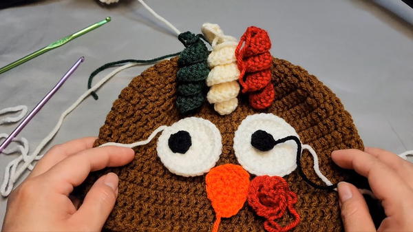 The crochet hat, featuring the characteristic eyes, beak, wattle, and decorative curls of a turkey, is now complete. This detailed project, combining flat appliqués and 3D amigurumi techniques, results in a festive and functional accessory perfect for the holidays.