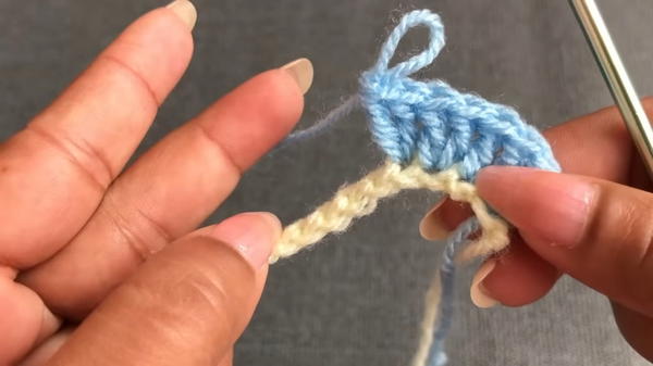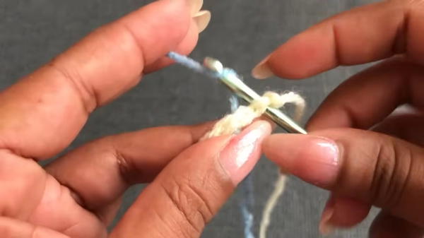 - Using a new yarn color (e.g., blue), join the yarn to the first chain.