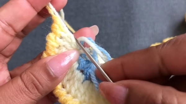- With the third yarn color (e.g., dark yellow), join it at the top of the last double crochet. Begin a chain of one and perform reverse single crochets (backward crochet) around the edges to form a decorative, sturdy border.