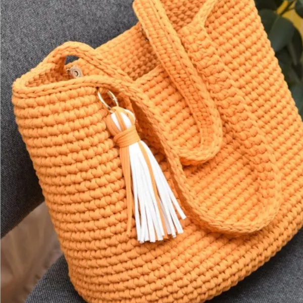 - With the third yarn color (e.g., dark yellow), join it at the top of the last double crochet. Begin a chain of one and perform reverse single crochets (backward crochet) around the edges to form a decorative, sturdy border.
