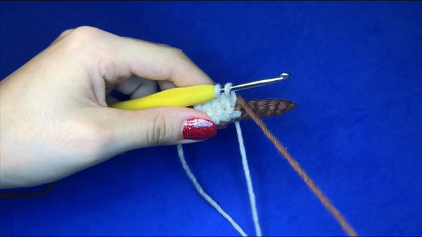 - Grab the new color yarn and pull through the loops to finish the stitch with the