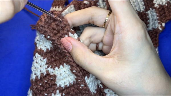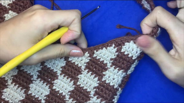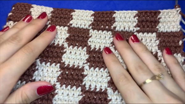 - Continue making blocks of 5 single crochet stitches alternating between brown and beige (or your chosen contrasting colors).
