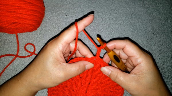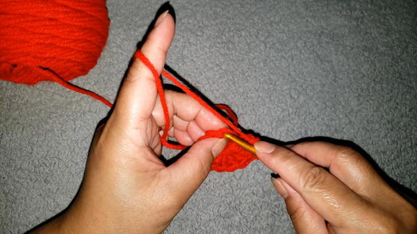 - Work 12 double crochets into the ring. Close the ring by pulling the inside strand halfway across and tightening the tail.