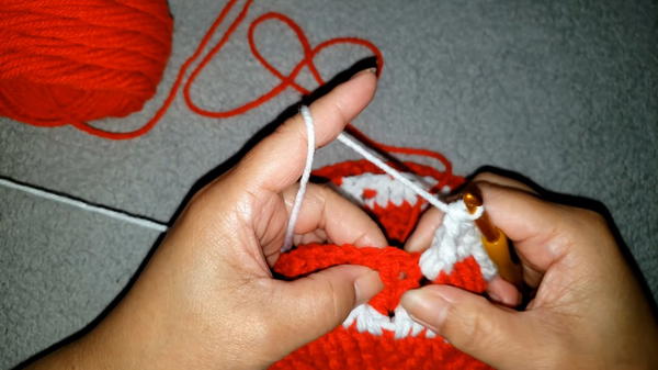 - Work 1 Double Crochet (DC) into each stitch around with the white yarn for a smooth transition.