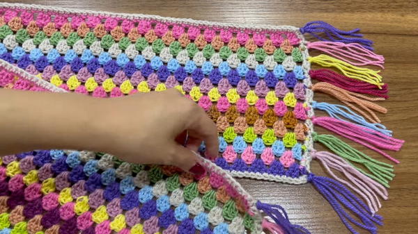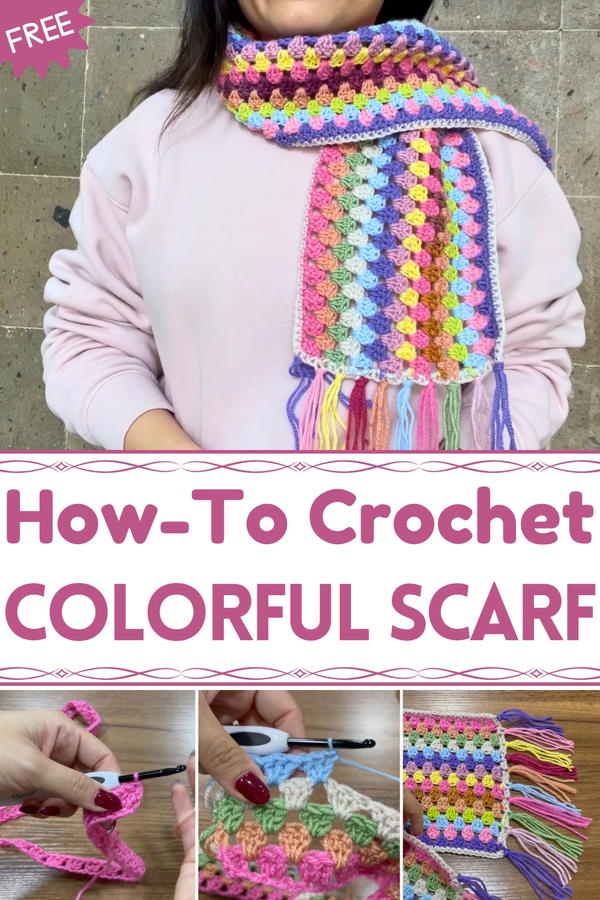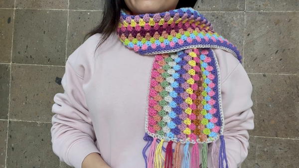This colorful granny stitch scarf is an affordable, fun, and creative way to use leftover yarn. With a simple pattern and easy-to-follow steps, it’s accessible to crocheters of any skill level. The tutorial guides you from start to finish, incorporating personalized color choices and optional decorative fringe for a polished final product.