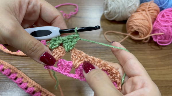 - For rows similar to row 3, begin the row by adding 2 double crochets in the starting space, making the first group of 3 stitches.