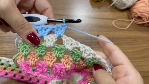 - In the spaces formed by the double crochet groups, make 2 single crochets.