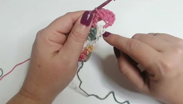 - Make a fan of 5 dc in the 3rd chain of the previous chain loops.