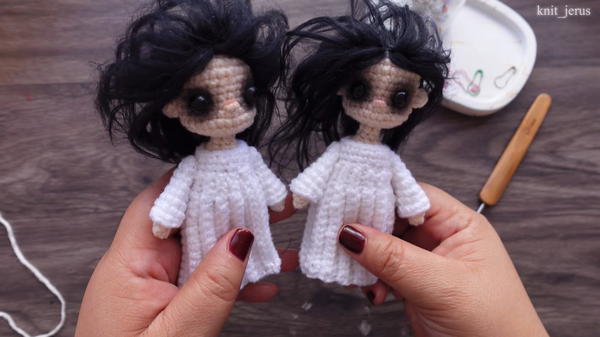 The completed mini La Llorona doll is a testament to the detail achievable in Amigurumi. Through careful shaping of the body and the unique construction of the dress and hair, the project results in a recognizable and beautiful collectible figure.