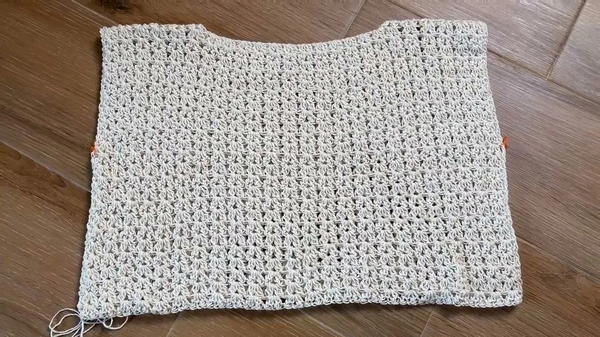 - After finishing front and back pieces, fold and mark sides for sewing seam, leaving 6 rows unstitched at sides for openings.